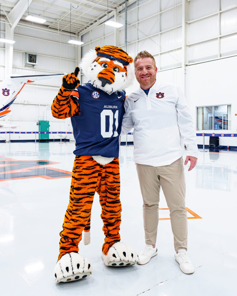 Aubie the Tiger poses with newly named Auburn Head Football Coach Alex Golesh at the Auburn University Regional Airport in Auburn, AL. / Photo by Austin Perryman